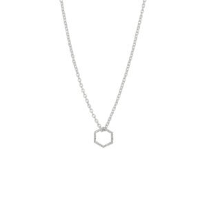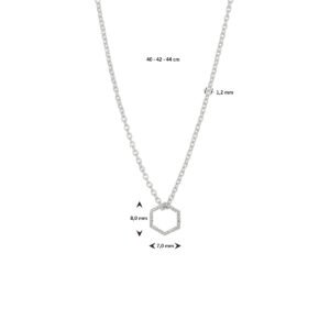 Dit anker collier met zeshoekige hanger is gemaakt van 925 sterling zilver, de allerbeste kwaliteit zilver, met een fijntjes gepolijst oppervlak dat mooi glanst en een laagje rhodium waardoor die glans extra lang behouden blijft. Dit collier bestaat uit meerdere slanke anker schakels die fijntjes op elkaar aansluiten en die samen een stijlvol geheel vormen met aan de voorkant een opengewerkte zeshoekige hanger met meerdere bolletjes. Aan de achterkant zit een handige karabijnsluiting, waardoor u dit collier gemakkelijk om- en afdoet. Dit collier is speciaal ontworpen voor dame sen heeft een maximale lengte van 44cm, met draaglengtes van 40cm, 42cm en 44cm.