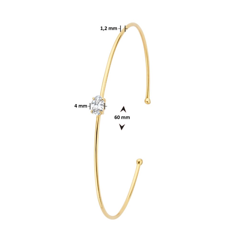 14k Geelgouden spang uitgevoerd met een schitterende zirkonia. De spang heeft een afmeting van 60×1.2mm.