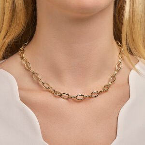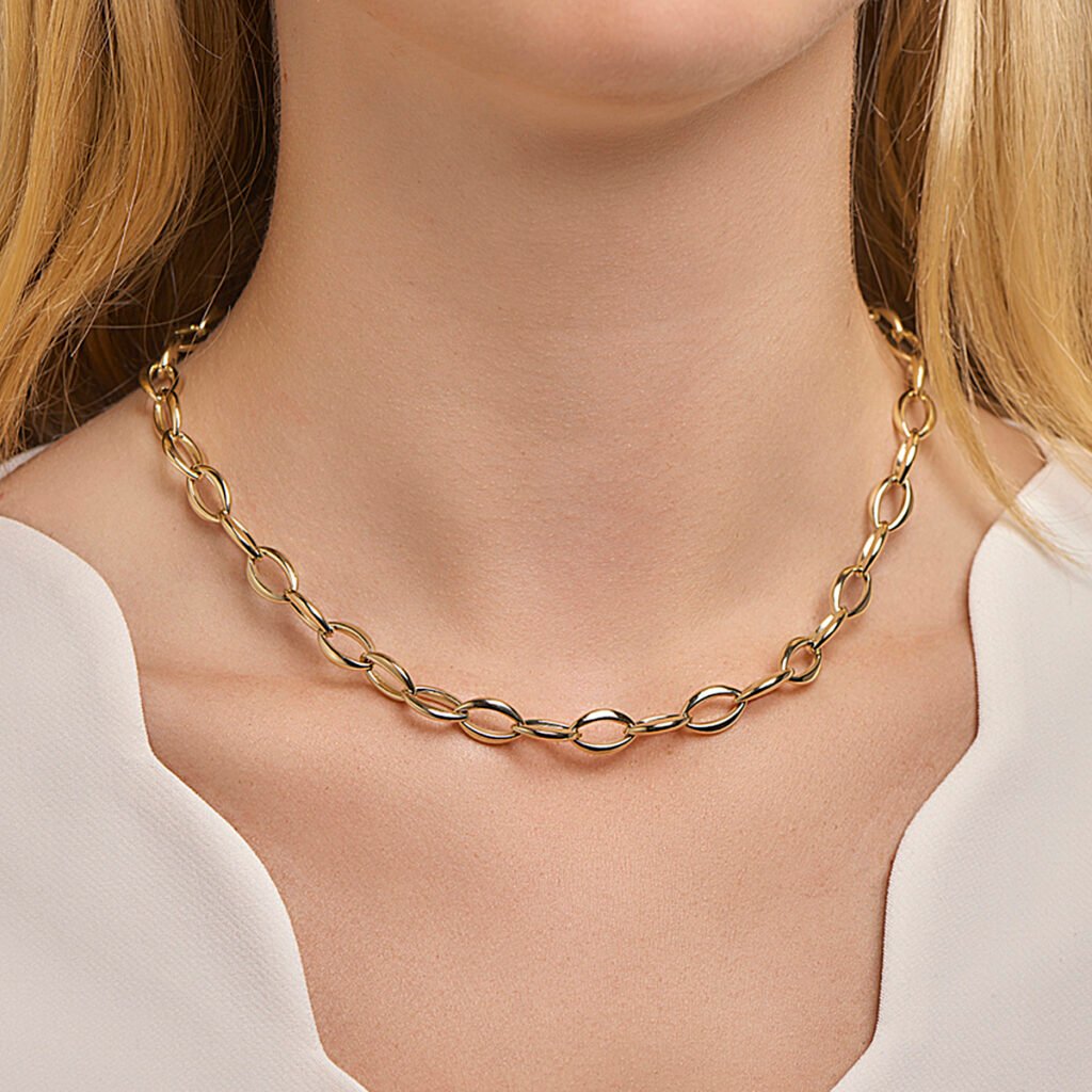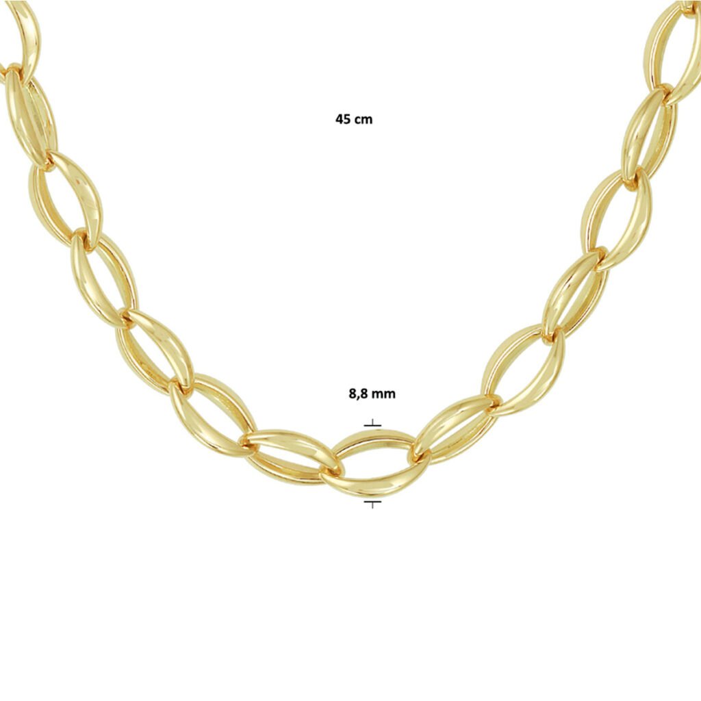 Dit robuuste collier is volledig gemaakt van 14 karaats geelgoud, de allerbeste kwaliteit geelgoud, en voorzien van een fijntjes gepolijst oppervlak dat mooi glanst. Dit collier bestaat uit meerdere robuuste anker schakels die fijntjes op elkaar aansluiten en samen een stijlvol doch robuust geheel vormen. Aan de achterkant zit een handige karabijnsluiting, waarmee u dit collier gemakkelijk om- en afdoet. Het collier heeft een lengte van 45cm met een breedte van 8,8mm.