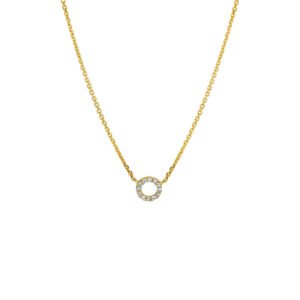 14k Geelgouden collier met een cirkel van diamant 0.05ct. De lengte bedraagt 41 – 43 – 45cm en de schakelbreedte is 0.8mm.