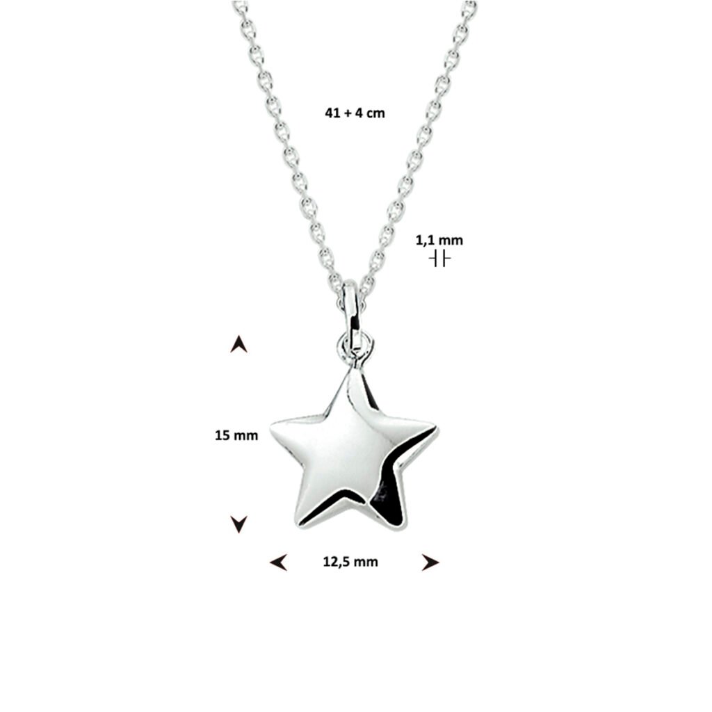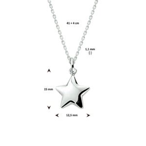 Dit Ster Hanger Collier van Zilver is volledig gemaakt van 925 sterling zilver, de allerbeste kwaliteit zilver, en voorzien van een hanger met een breedte van 12,5mm en een hoogte van 15mm. Dit collier bestaat uit een anker schakelketting met daaraan een hanger in de vorm van een vijfpuntige ster die gepolijst is en dus mooi glanst. Dit collier heeft een totale lengte van 45cm en kan gemakkelijk ingekort worden naar 41cm. De anker schakels van dit collier hebben een breedte van 1,1mm.