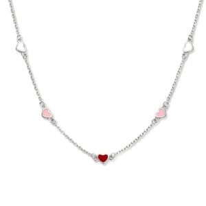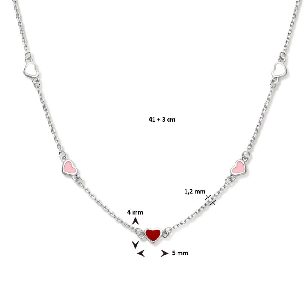 Gerhodineerd 925 zilveren collier met gekleurde hartjes hangers van 4x5mm. Het collier heeft een draaglengte van 41cm en een extensie van 3cm. De schakelbreedte is 1.2mm. Uitgevoerd met een karabijn sluiting.