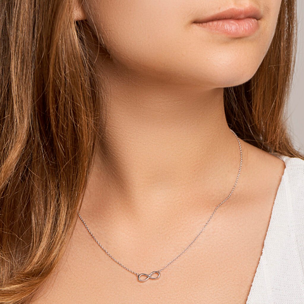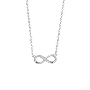 Gerhodineerd zilveren collier met infinity teken en zirkonia. Het collier is onderdeel van een set. De lengte van het collier bedraagt 41cm met 4cm extensie. De schakelbreedte bedraagt 1.2mm.