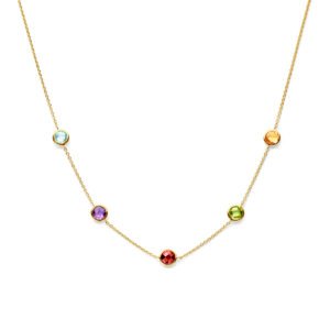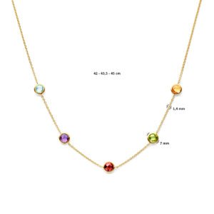 Geelgoud op 925 zilveren collier uitgevoerd met amethist, blauw topaas, granaat, peridot en citrien. Het collier heeft draaglengtes van 42-43.5-45cm. Uitgevoerd met karabijnsluiting. Geen garantie op de plating.