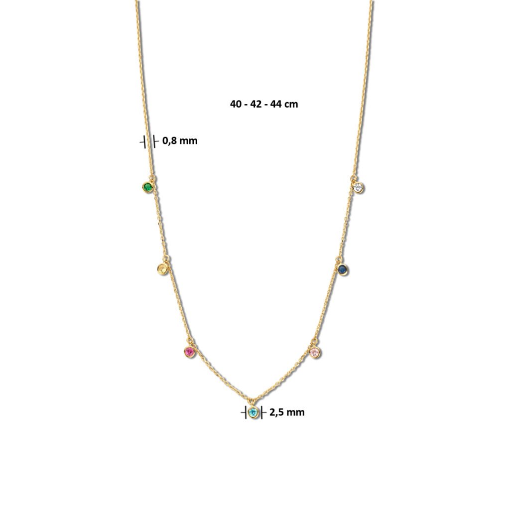 14k Geelgouden collier met gekleurde zirkonia stenen. Het collier heeft draaglengtes van 40, 42 en 44cm. De schakelbreedte is 0.8mm.