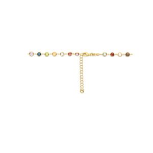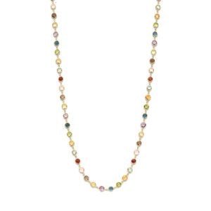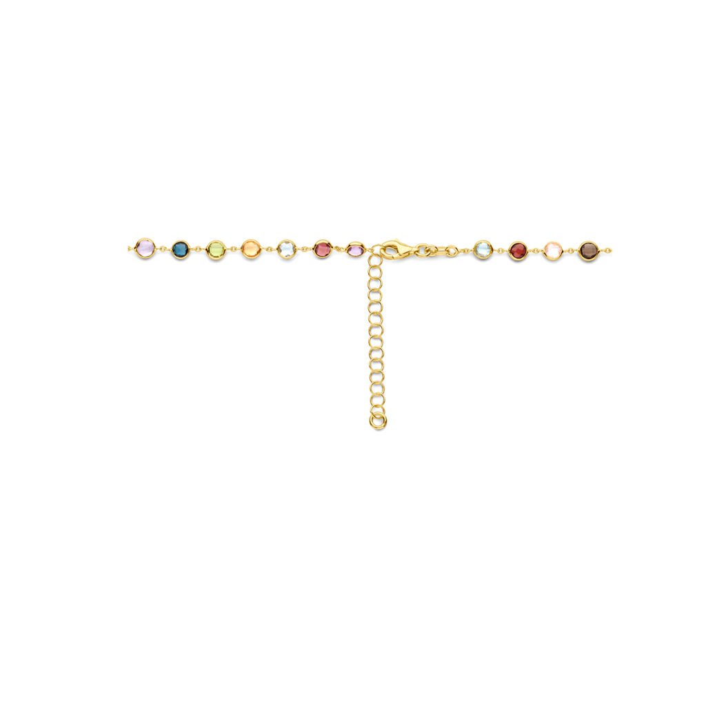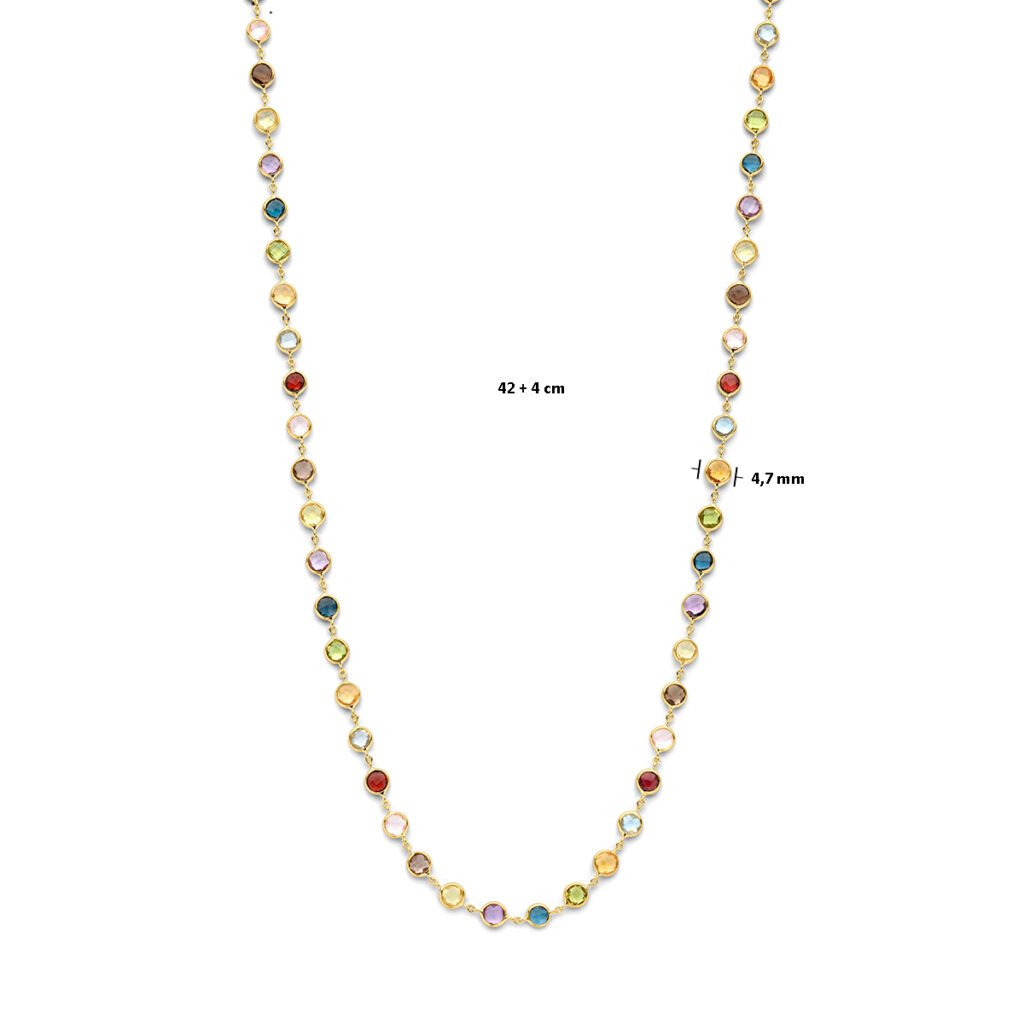 14k Geelgouden collier met verschillende kleurstenen zoals: peridot, London blue topaas, amethist, lemon kwarts, rookkwarts, rozenkwarts, granaat, blauw topaas en citrien. Het collier heeft een draaglengte van 42cm en een extensie van 4cm. Uitgevoerd met een karabijn sluiting.