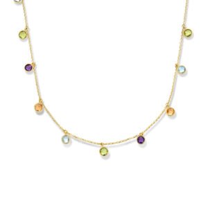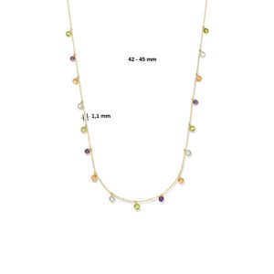 14k Geelgouden collier uitgevoerd met peridot, blauwe topaas, citrien en amethist. Het collier heeft draaglengtes van 42 en 45cm. Uitgevoerd met een karabijn sluiting. De schakelbreedte is 1.1mm. De steengewichten zijn: amethist 0.40ct (4x 0.10ct), citrien 0.40ct (4x 0.10ct), peridot 0.50ct (5x 0.10ct) en de blauw topaas 0.40ct (4x 0.10ct).