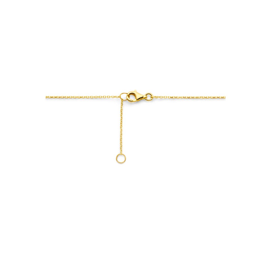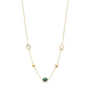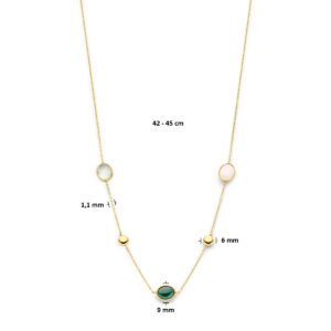 14k Geelgouden collier uitgevoerd met wit aventurijn, groen amethist en groen toermalijn. Het collier heeft draaglengtes van 42-45cm. De schakelbreedte is 1.1mm.