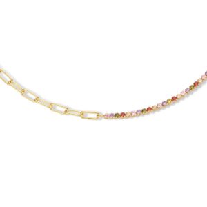 Geelgoud op 925 zilveren collier uitgevoerd met een paperclip schakel, gekleurd zirkonia en een karabijnsluiting. Het collier heeft een draaglengte van 40cm met een extensie van 5cm. De schakelbreedte is 3.6mm. Geen garantie op plating.