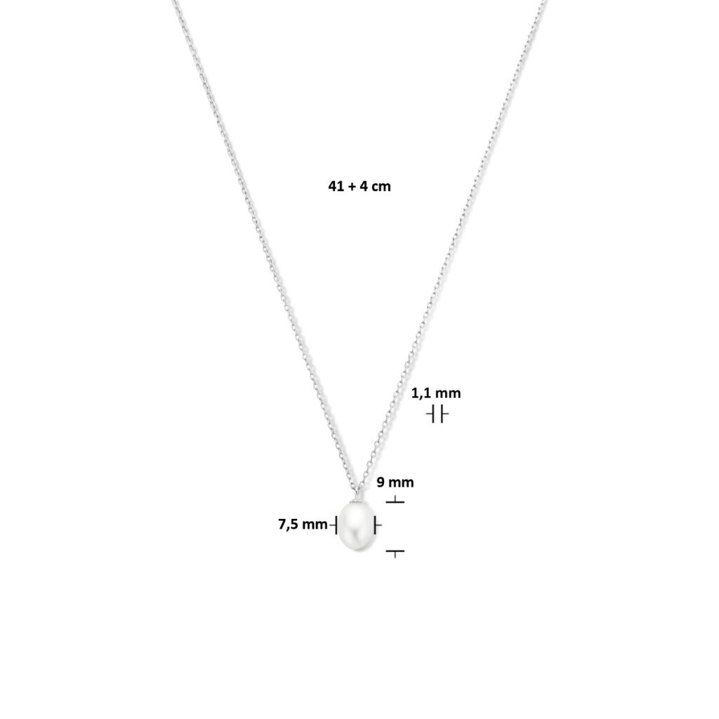 Gerhodineerd 925 zilveren collier uitgevoerd met een schitterende zoetwaterparel. Het collier heeft een draaglengte van 41cm en een extensie van 4cm. De schakelbreedte is 1.1mm.