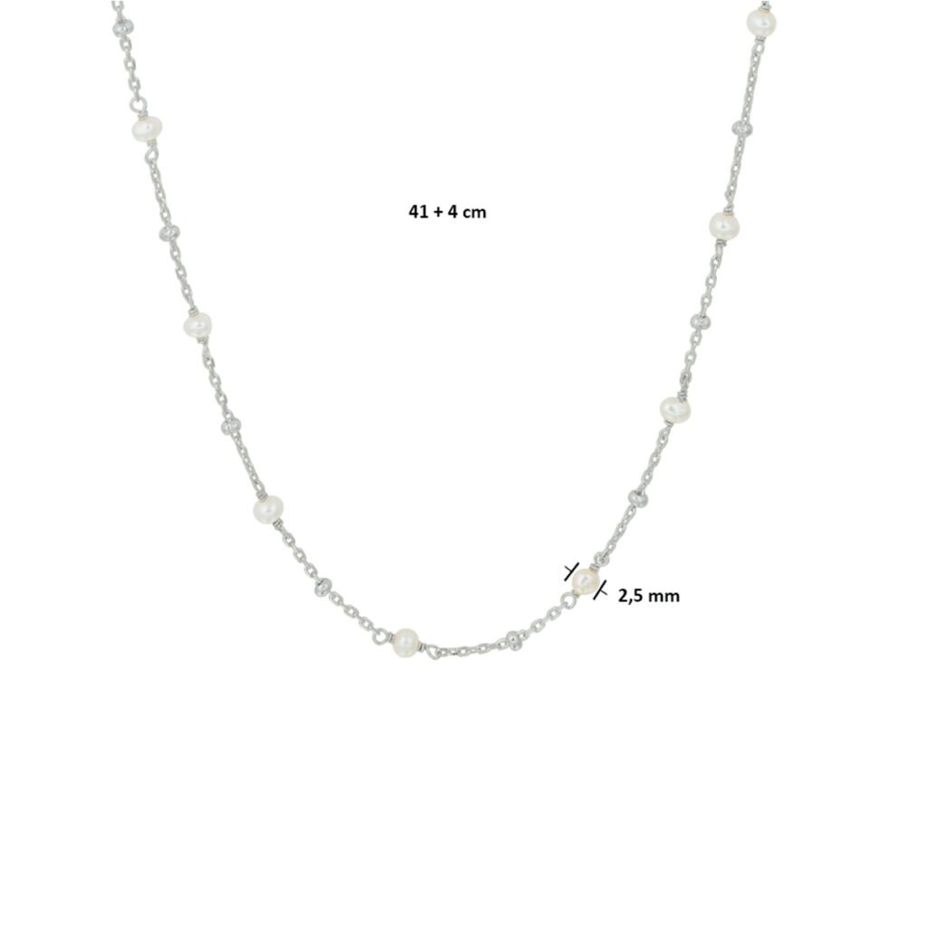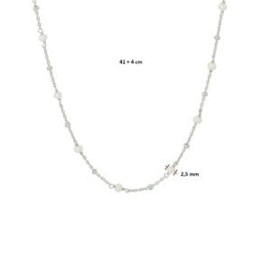 Gerhodineerd 925 zilveren collier uitgevoerd met een witte parel. Het collier heeft een draaglengte van 41cm met een extensie van 4cm. De parel heeft een breedte van 2.5mm. De schakelbreedte is 1.0mm.
