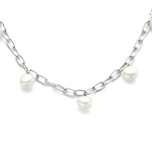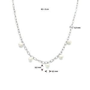 Gerhodineerd 925 zilveren collier uitgevoerd met zoetwaterparels. Het collier heeft een draaglengte van 42cm met een extensie van 3cm en een stevige karabijn sluiting. De schakelbreedte is 2.8mm.