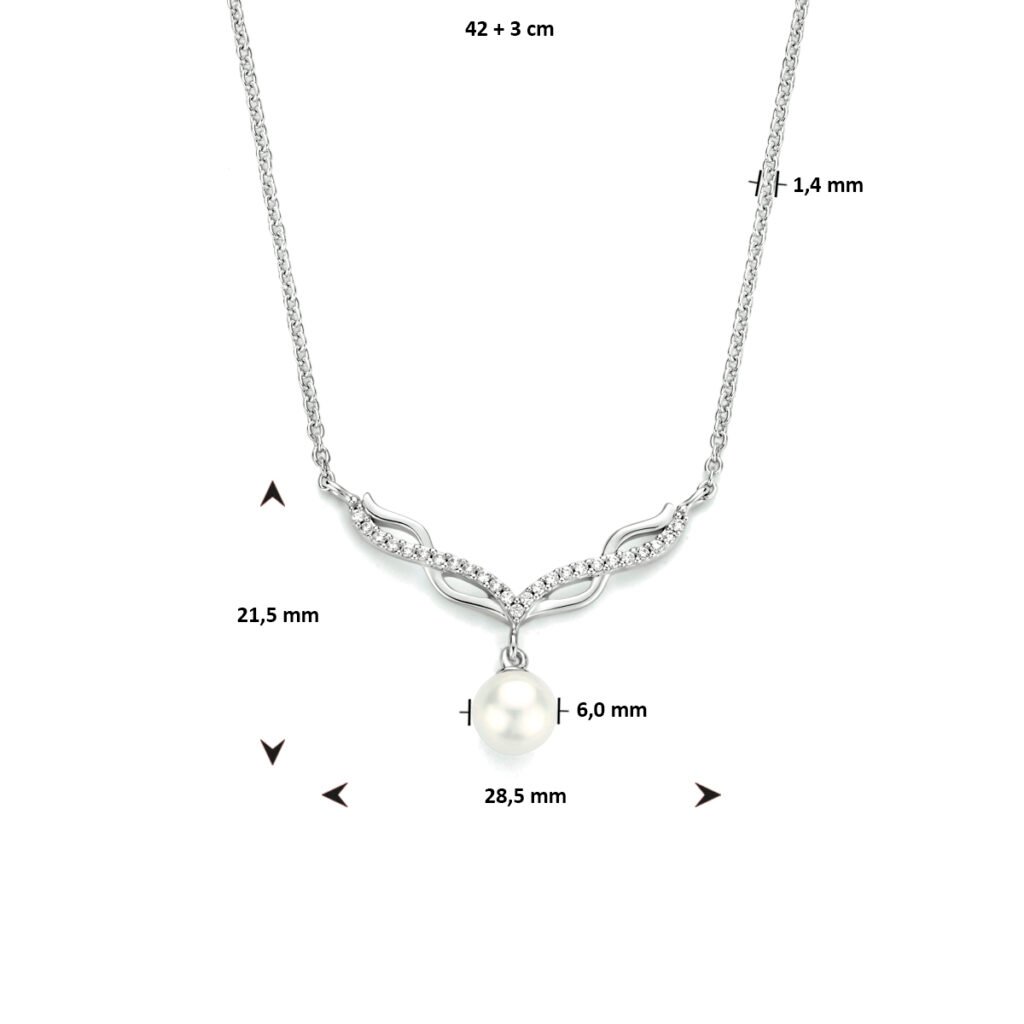 Gerhodineerd 925 zilveren collier uitgevoerd met een zoetwaterparel en een schitterende zirkonia rij. Het collier heeft een draaglengte van 42cm met een extensie van 3cm en een stevige karabijn sluiting. De schakelbreedte is 1.4mm.