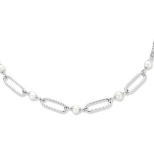 Gerhodineerd 925 zilveren collier met zoetwaterparels. Het collier heeft een draaglengte van 41cm en een extensie van 4cm. Uitgevoerd met een karabijn sluiting. De schakelbreedte is 6.2mm.