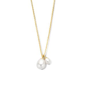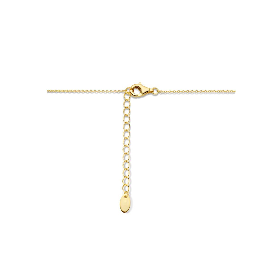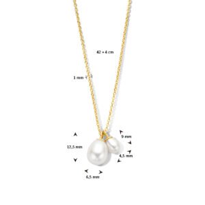 Geelgoud op 925 zilveren collier uitgevoerd met zoetwaterparels en een karabijnsluiting. Het collier heeft een schakelbreedte van 1mm en een draaglengte van 42cm met 4cm extensie. Geen garantie op de plating