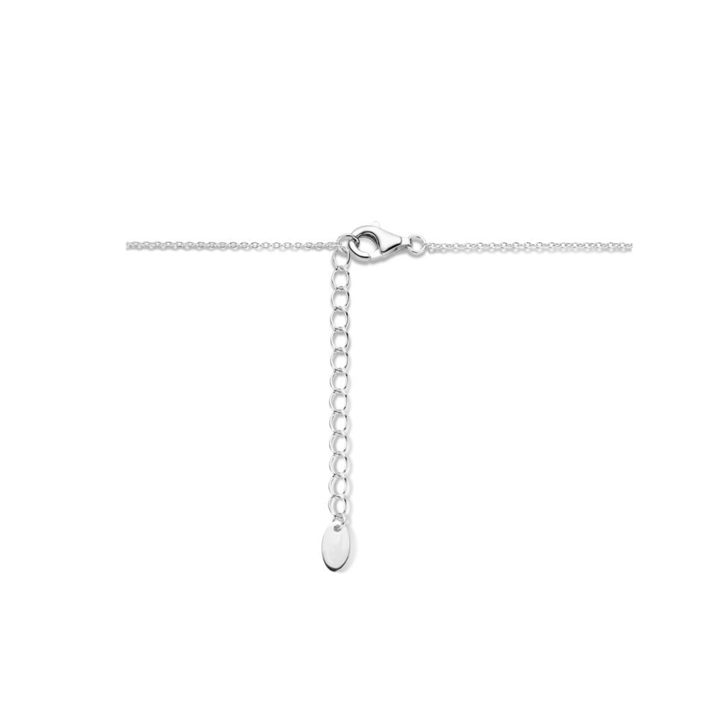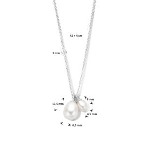 Gerhodineerd 925 zilveren collier uitgevoerd met zoetwaterparels en een karabijnsluiting. Het collier heeft een schakelbreedte van 1mm en een draaglengte van 42cm met 4cm extensie.
