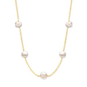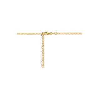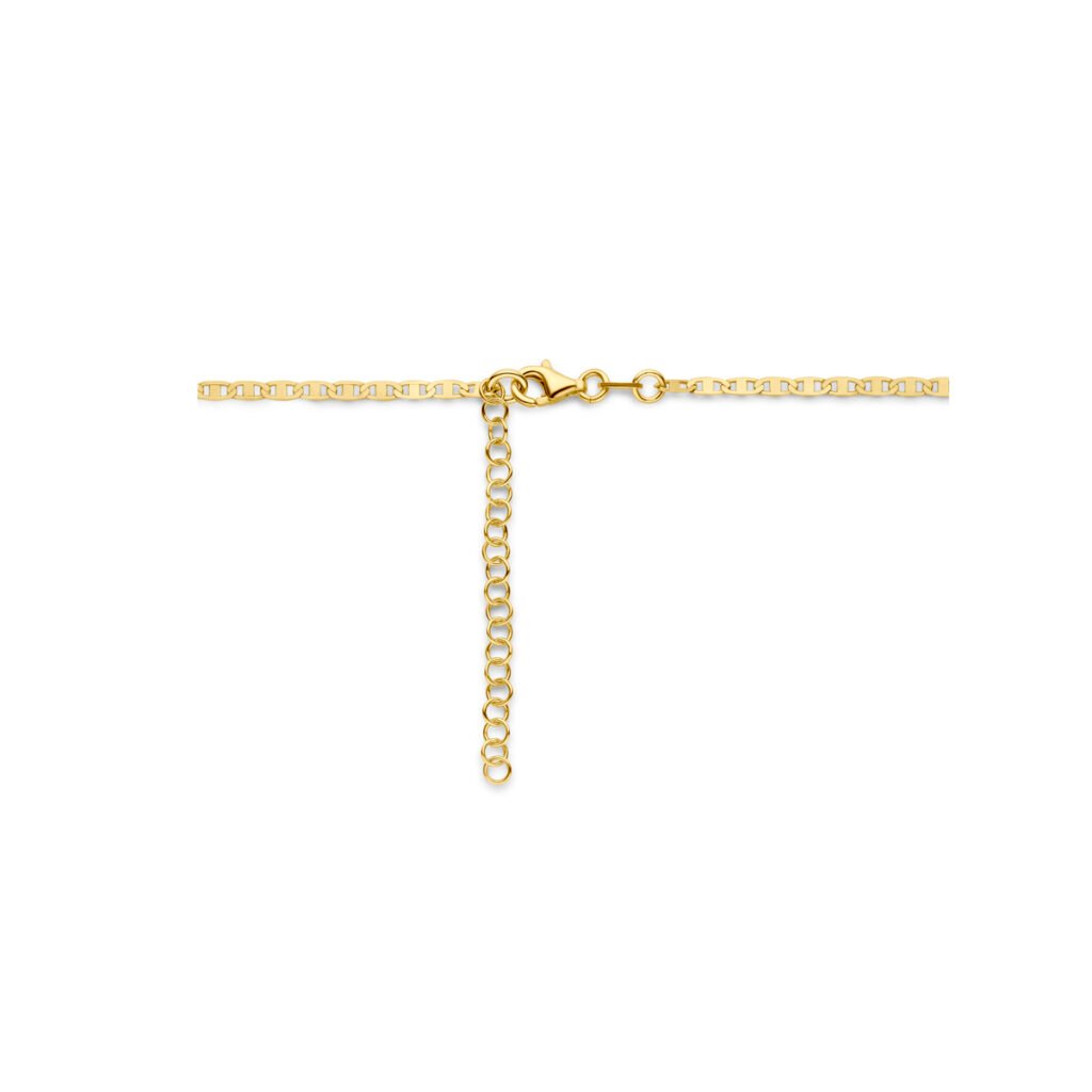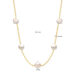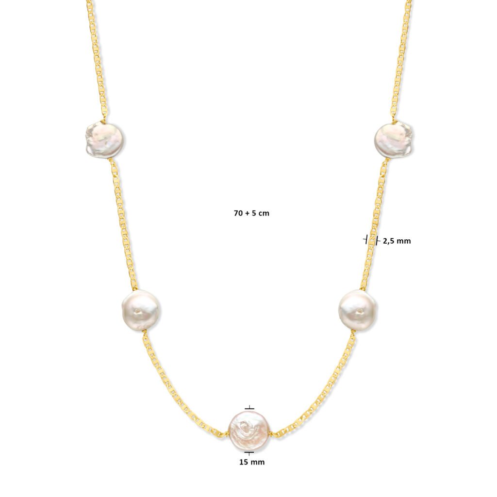 Geelgouden op 925 zilveren collier uitgevoerd met parels en een karabijn sluiting. Het collier heeft een schakelbreedte van 2.5mm en een draaglengte van 70cm met 5cm extensie. Geen garantie op plating.