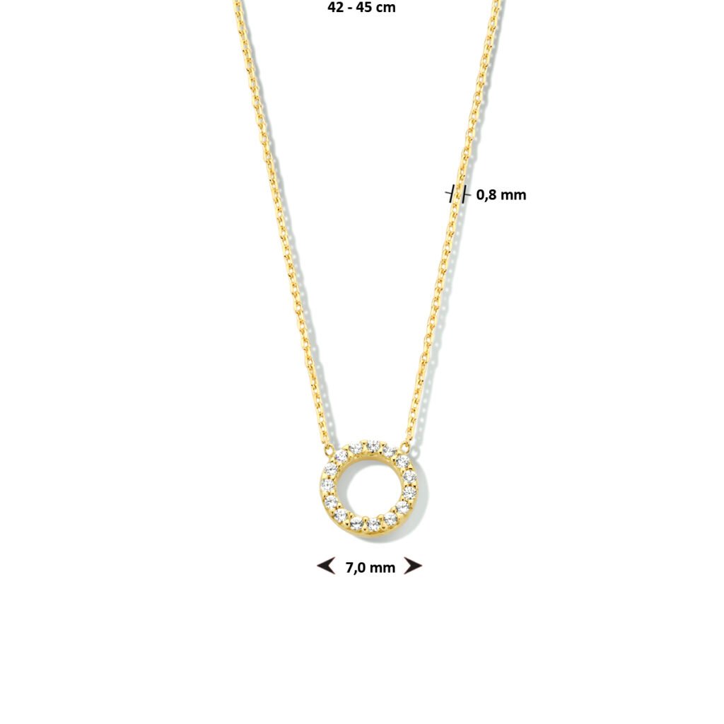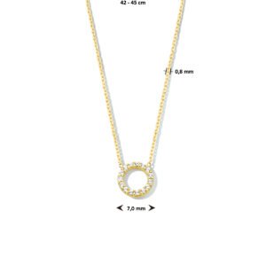 14k Geelgouden collier uitgevoerd met een ronde hanger met daarin een schitterende zirkonia rij. Het collier heeft draaglengtes van 42 en 45cm. Het rondje heeft een diameter van 7mm. De schakelbreedte is 0.8mm.