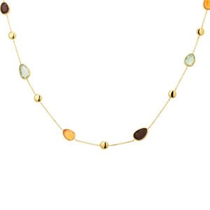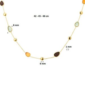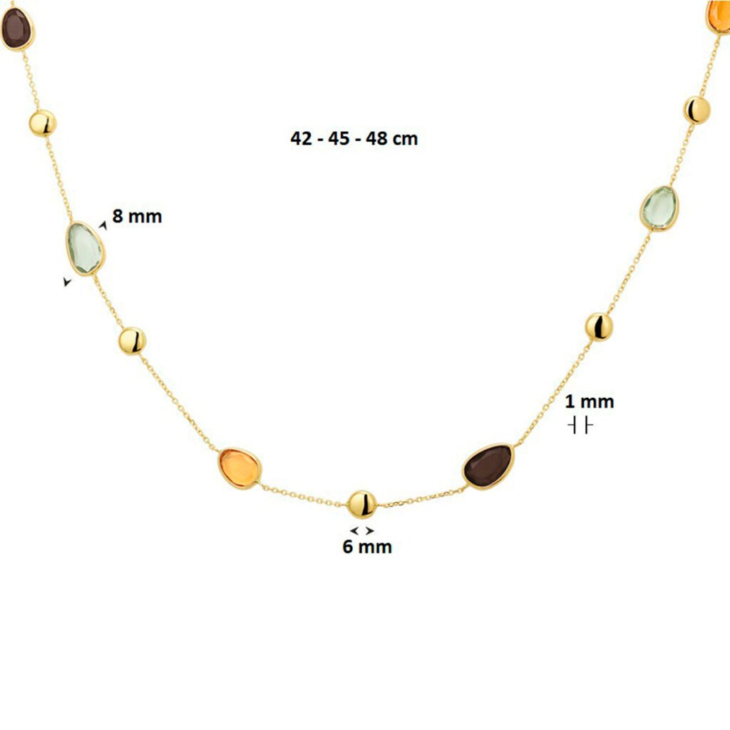 Dit Geelgouden Anker Collier met Kleurrijke Edelstenen Mix is volledig gemaakt van 14 karaats geelgoud, de allerbeste kwaliteit geelgoud, met een gepolijst oppervlak en meerdere edelstenen. Dit collier heeft een lengte van 48cm. Dit sieraad bestaat uit een slank anker collier met meerdere opengewerkte schakels die fijntjes op elkaar aansluiten, met diverse gekleurde edelstenen die op gelijke afstanden van elkaar geplaatst zijn en worden onderbroken met een gepolijst bolletje. Dit collier is voorzien van een fijntjes gepolijst oppervlak dat mooi glanst, met aan de achterkant een handige sluiting, waarmee u dit collier gemakkelijk om- en afdoet. Deze hanger is geschikt voor dames en is bijzonder leuk als cadeau. Dit sieraad zal tevens niet misstaan op bijvoorbeeld een luxe gala of een black-tie event. Deze hanger behoort tot onze huiscollectie, waardoor u verzekerd bent van de allerbeste kwaliteit tegen de scherpste prijs!