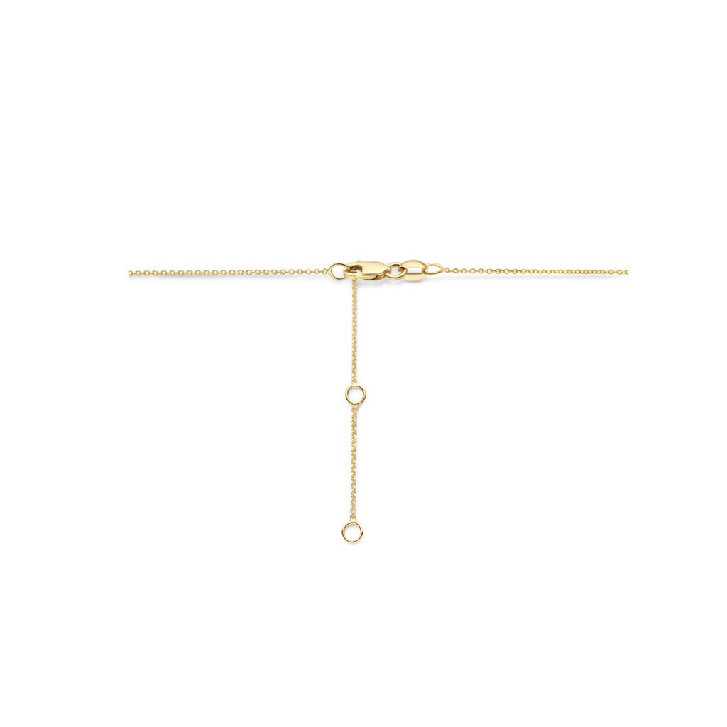 14k Geelgouden collier uitgevoerd met saffier en diamant. Het collier heeft draaglengtes van 41, 43 en 45cm. Het collier is uitgevoerd met een karabijn sluiting. De schakelbreedte is 0.8mm.