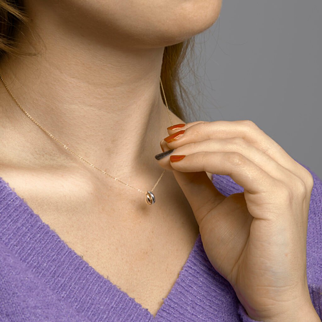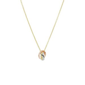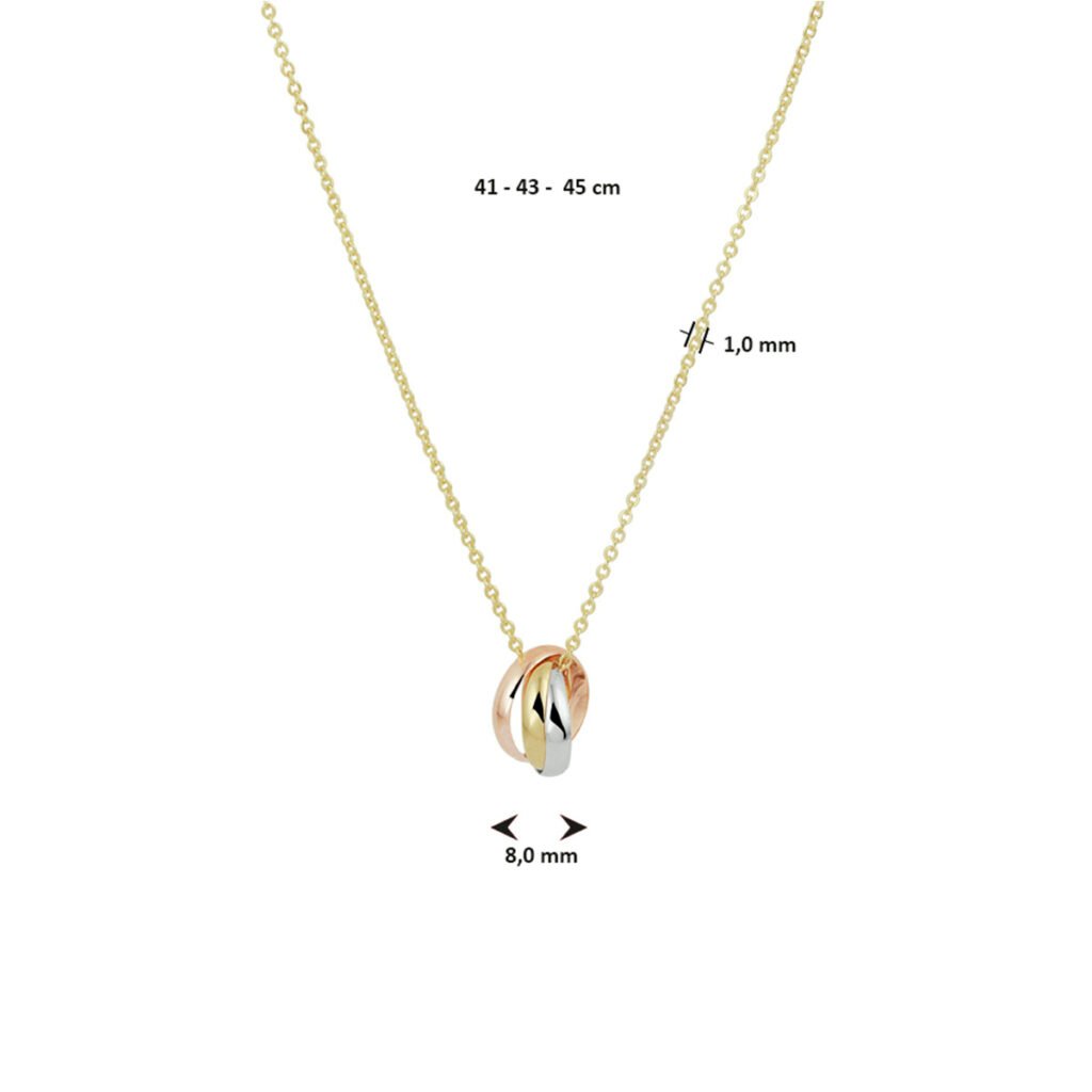 14k Geelgouden collier uitgevoerd met een tricolor rose- geel en witgouden hangertje bestaande uit drie in elkaar gedraaide ringetjes. Het collier heeft draaglengtes van 41, 43 en 45cm. De schakelbreedte is 1.0mm.