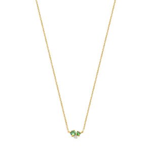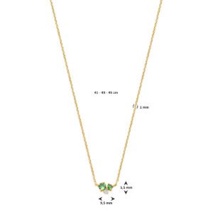 14k Geelgouden collier uitgevoerd met tsavoriet en diamant. Het collier heeft draaglengtes van 41-43-45cm. De totale diamantgewicht is 0.03ct. Uitgevoerd met karabijnsluiting.