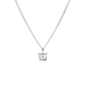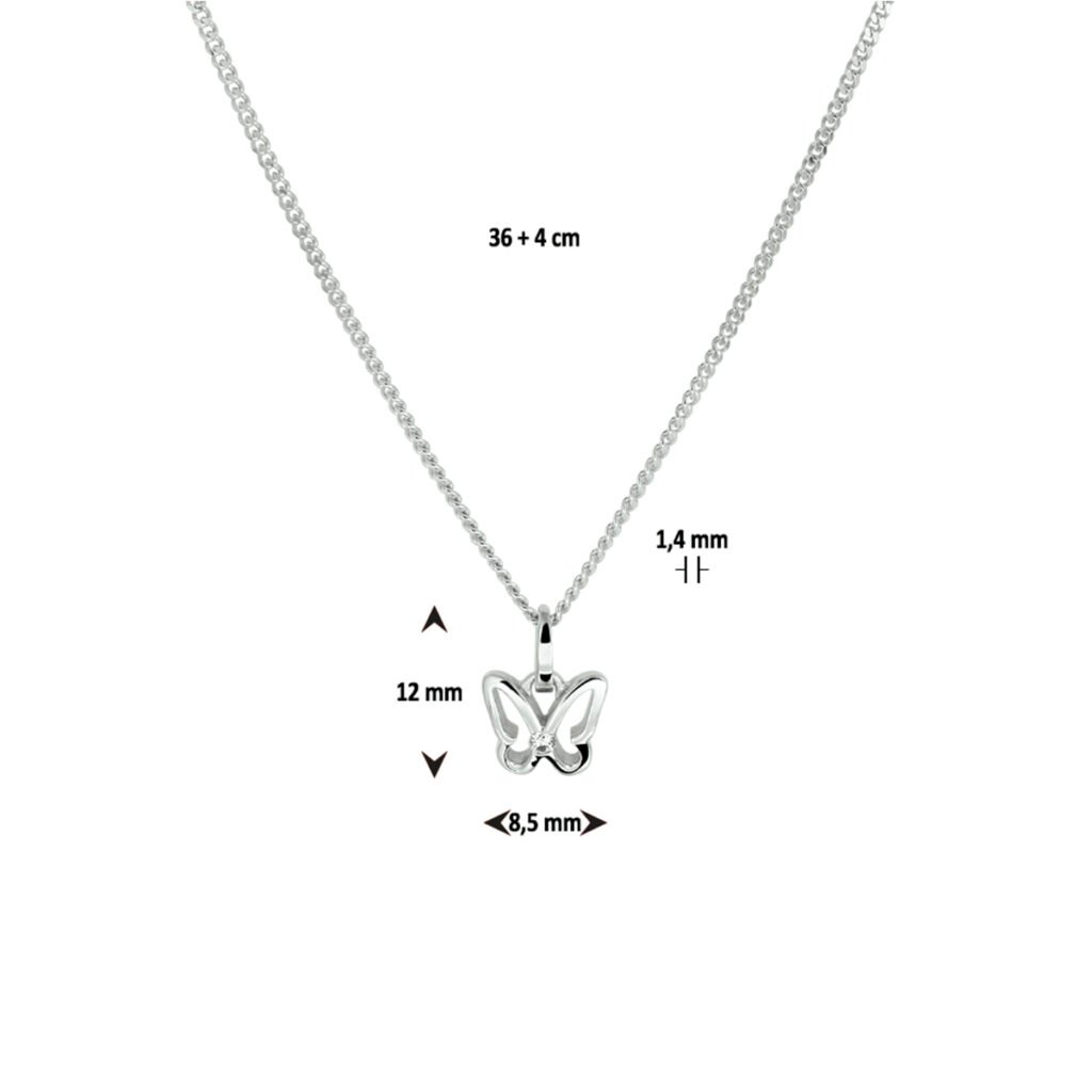 Gerhodineerd zilveren collier uitgevoerd met een hanger in de vorm van een vlinder met heldere zirkonia. Het collier heeft een draaglengte van 36cm met een extensie van 4cm en is uitgevoerd met een karabijn sluiting. De schakelbreedte is 1.4mm.