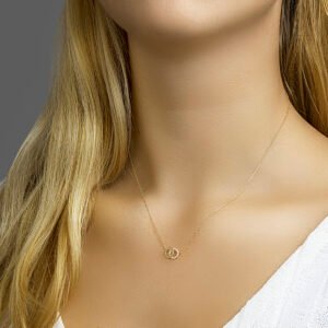 14k Geelgouden collier met twee rondjes met zirkonia. De lengte bedraagt 40cm met 4cm extensie en de schakelbreedte is 0.8mm. De rondjes hebben een totale grootte van 7,5x11mm.
