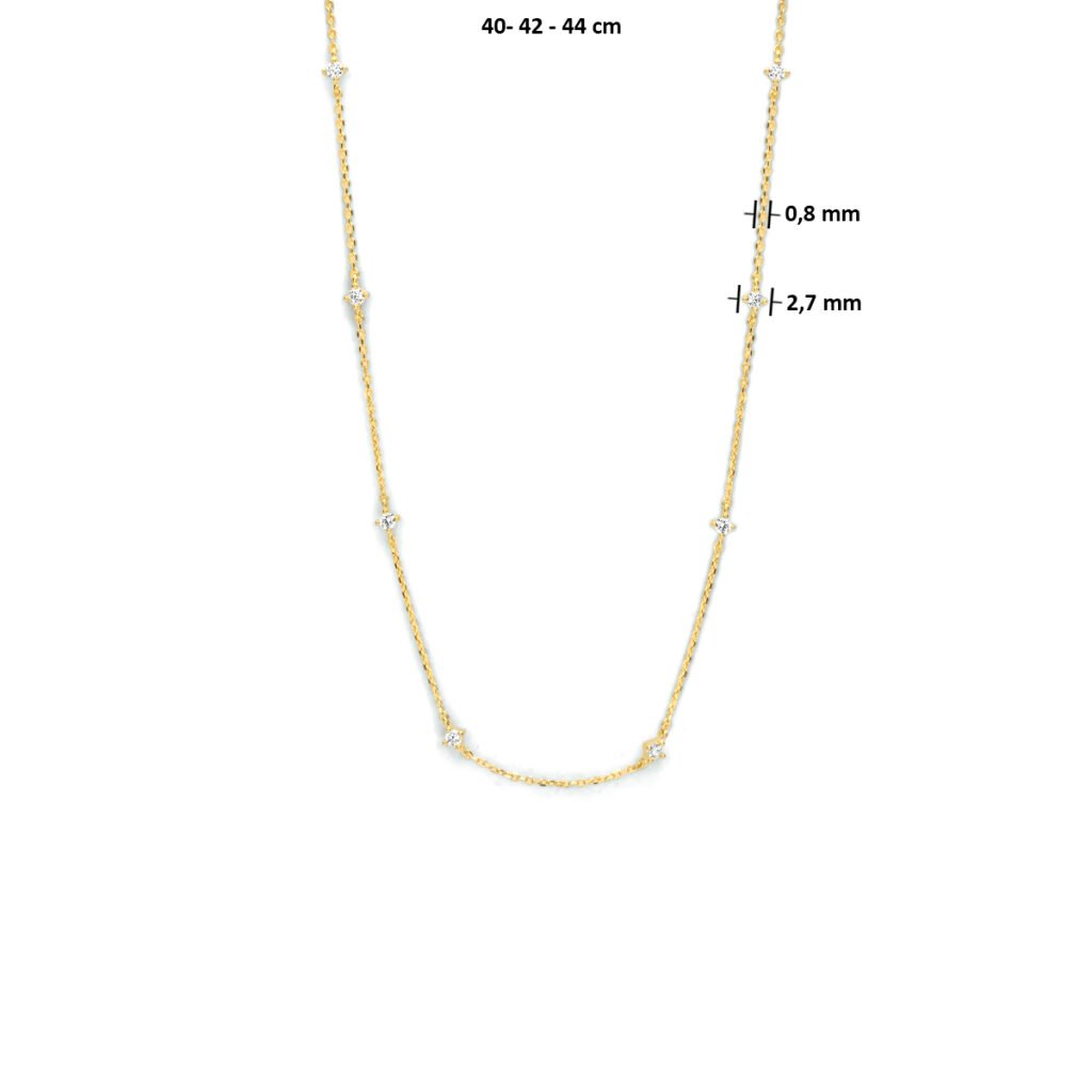 14k Geelgouden collier uitgevoerd met een schitterende zirkonia rij. Het collier heeft een schakelbreedte van 0.8mm en draaglengtes van 40, 42 en 44cm. De schakelbreedte is 2.7mm.