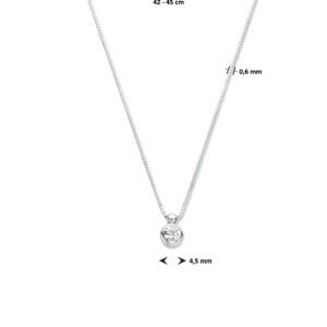 14k Witgouden collier uitgevoerd met een hanger met daarin een schitterende zirkonia. Het collier heeft draaglengtes van 42 en 45cm. De hanger heeft een diameter van 4.5mm. De schakelbreedte is 0.6mm.