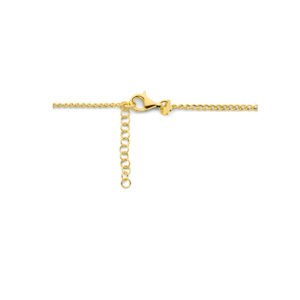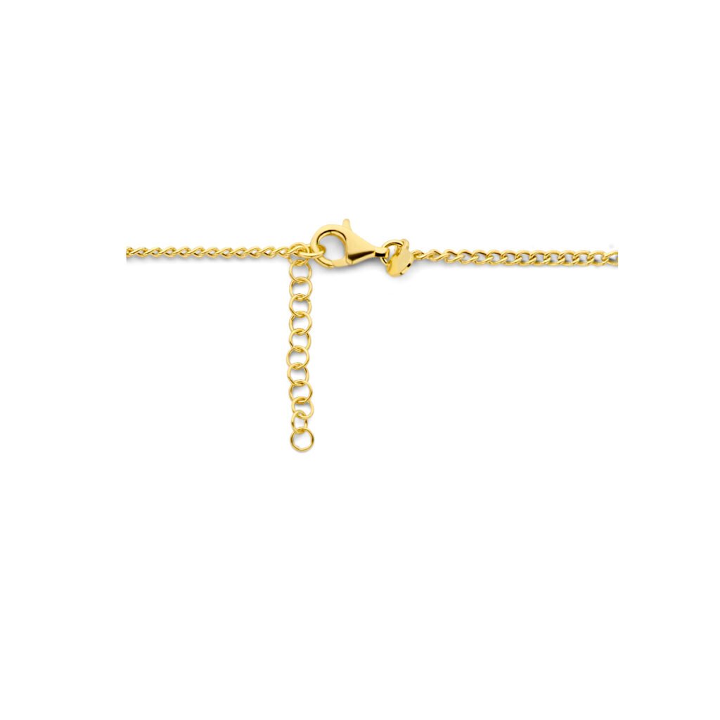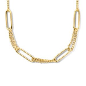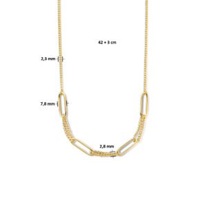 Geelgoud op 925 zilveren collier uitgevoerd met een paperclip schakel van 7.8mm, gourmette schakel van 2.8mm en een karabijn sluiting. Het collier heeft een draaglengte van 42cm en een extensie van 3cm.