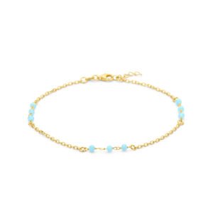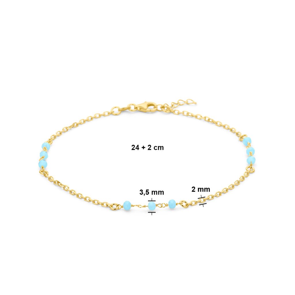 Geelgoud op 925 zilveren enkelbandje uitgevoerd met blauw kristal bolletjes. Het enkelbandje heeft een draaglengte van 24cm en een extensie van 2cm. Uitgevoerd met een karabijn sluiting. Geen garantie op de plating.