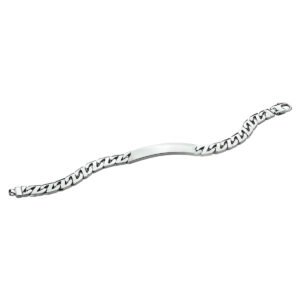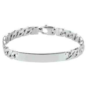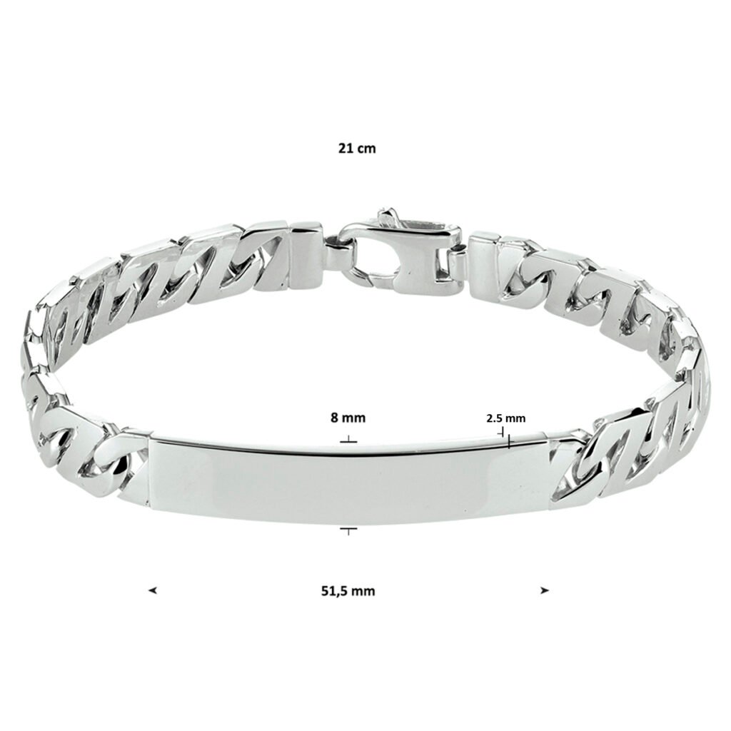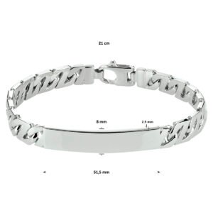 Deze gerhodineerde zilveren heren armband is uitgevoerd met een stevige karabijnsluiting en een stijlvolle graveerplaat. De graveerplaat heeft een breedte van 8 mm en een dikte van 2,5 mm, ideaal voor een persoonlijke gravure. De schakelbreedte bedraagt 8,0 mm, wat zorgt voor een robuuste en eigentijdse uitstraling.
