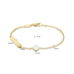 14k Geelgouden graveerarmband uitgevoerd met een parelmoer hart en een graveerplaat. De schakelbreedte is 1.5mm en is uitgevoerd met karabijnsluiting.