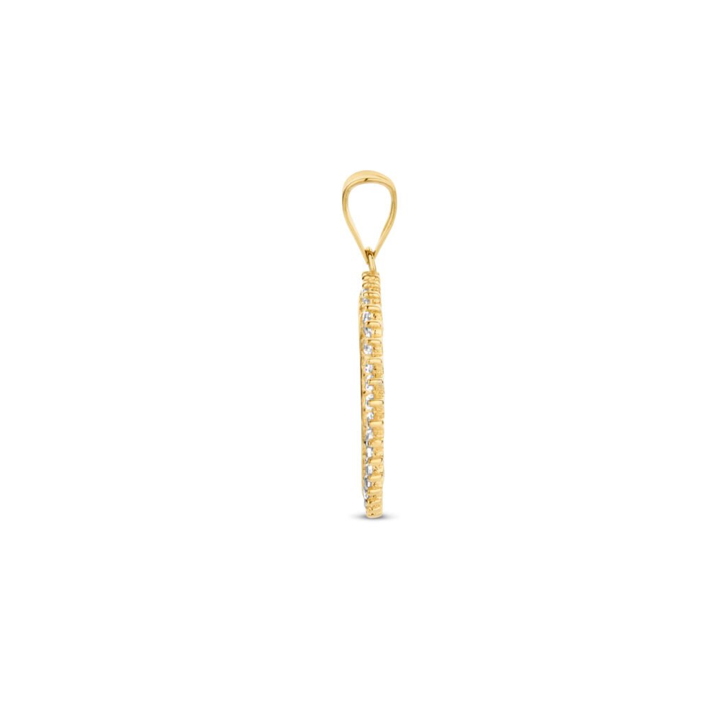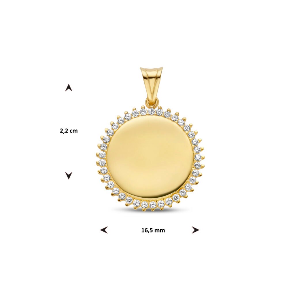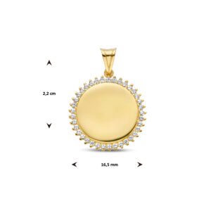 14k Geelgouden ronde graveerhanger uitgevoerd met zirkonia. De hanger heeft een totaalhoogte van 22mm.