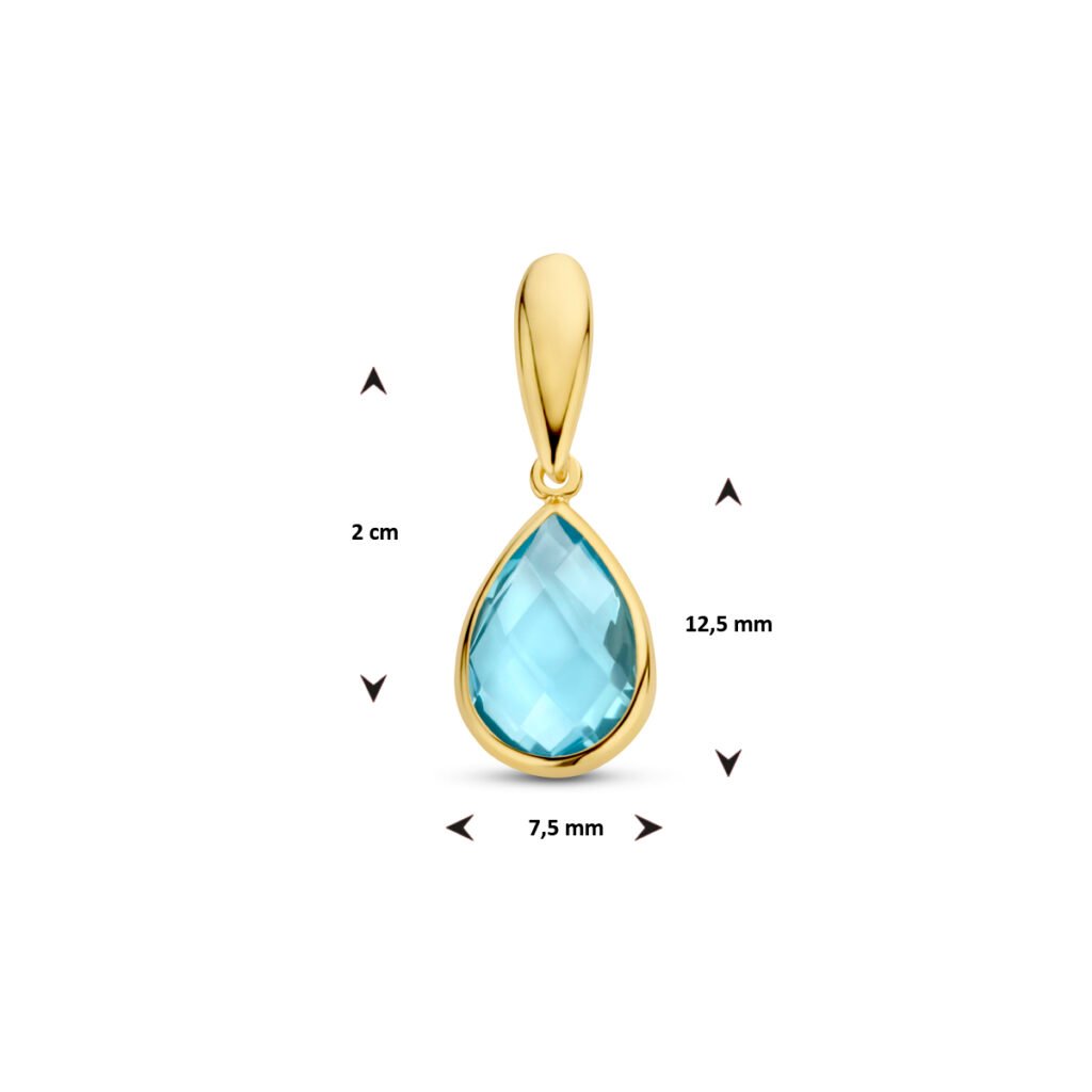14k Geelgouden hanger uitgevoerd met een schitterende blauwe topaas. De hanger heeft een totale hoogte van 2cm.