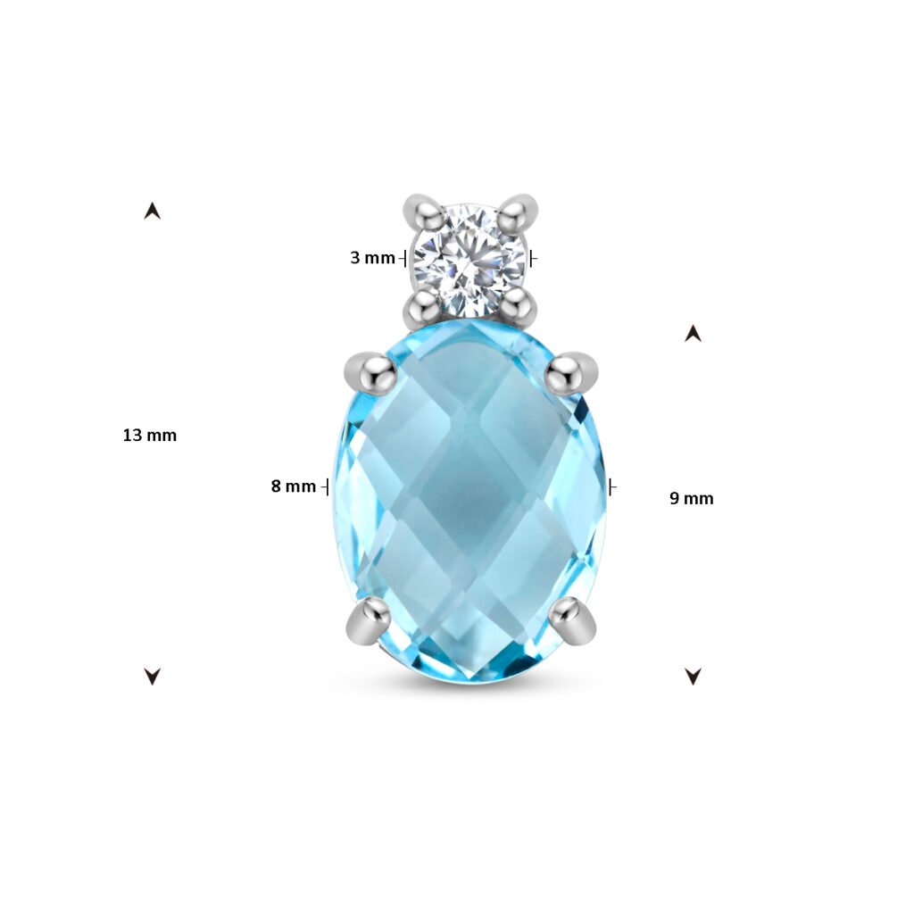 Gerhodineerd 925 zilveren hanger uitgevoerd met blauw topaas en zirkonia. De hanger heeft een totale hoogte van 13mm.