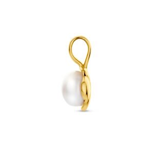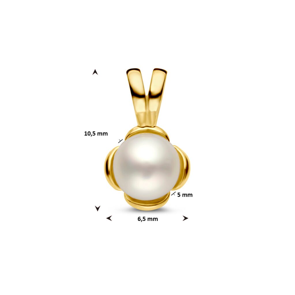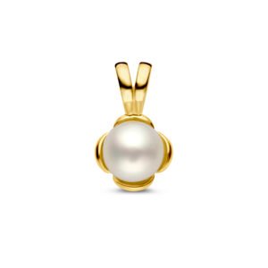 14k Geelgouden hanger uitgevoerd met een zoetwaterparel. De hanger heeft een totale hoogte van 10.5mm.
