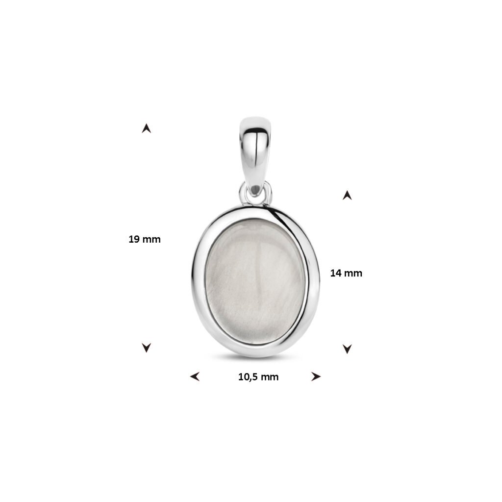 Gerhodineerd 925 zilveren hanger uitgevoerd met donkergrijs maansteen. De hanger heeft een afmeting van 14×10.5mm.