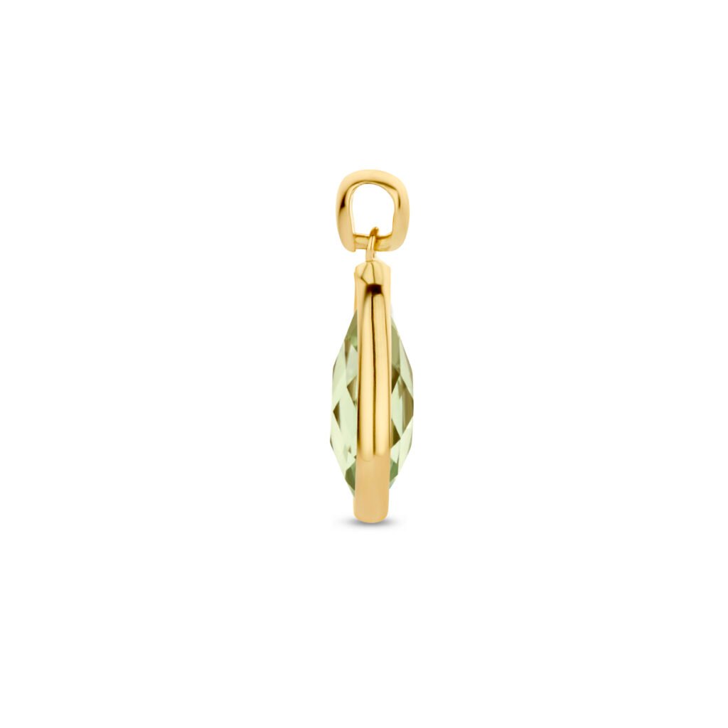 14k Geelgouden hanger uitgevoerd met een schitterende groen amethist. De hanger heeft een afmeting van 9x15mm.