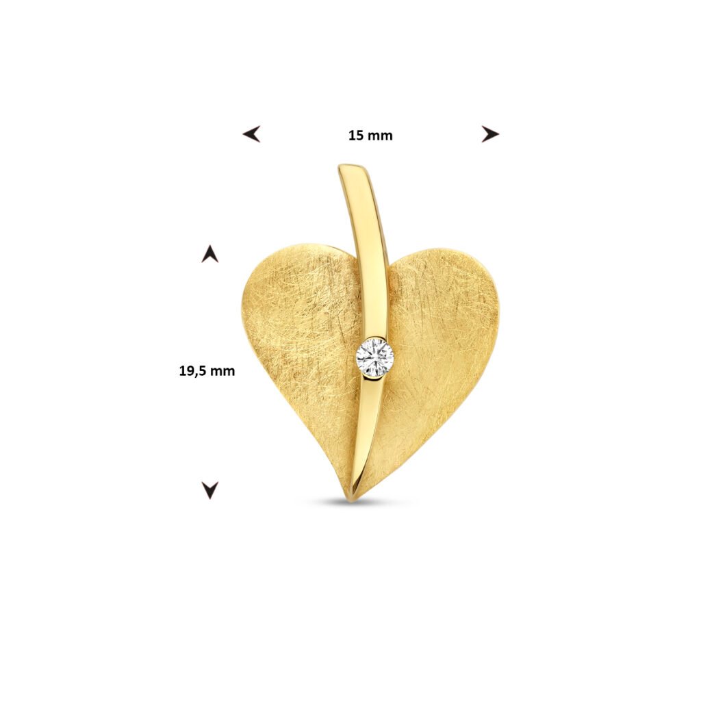 14k Geelgouden hanger uitgevoerd in vorm van een hart en een schitterende diamant daarin. Het hangertje heeft een afmeting van 19.5x15mm.