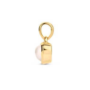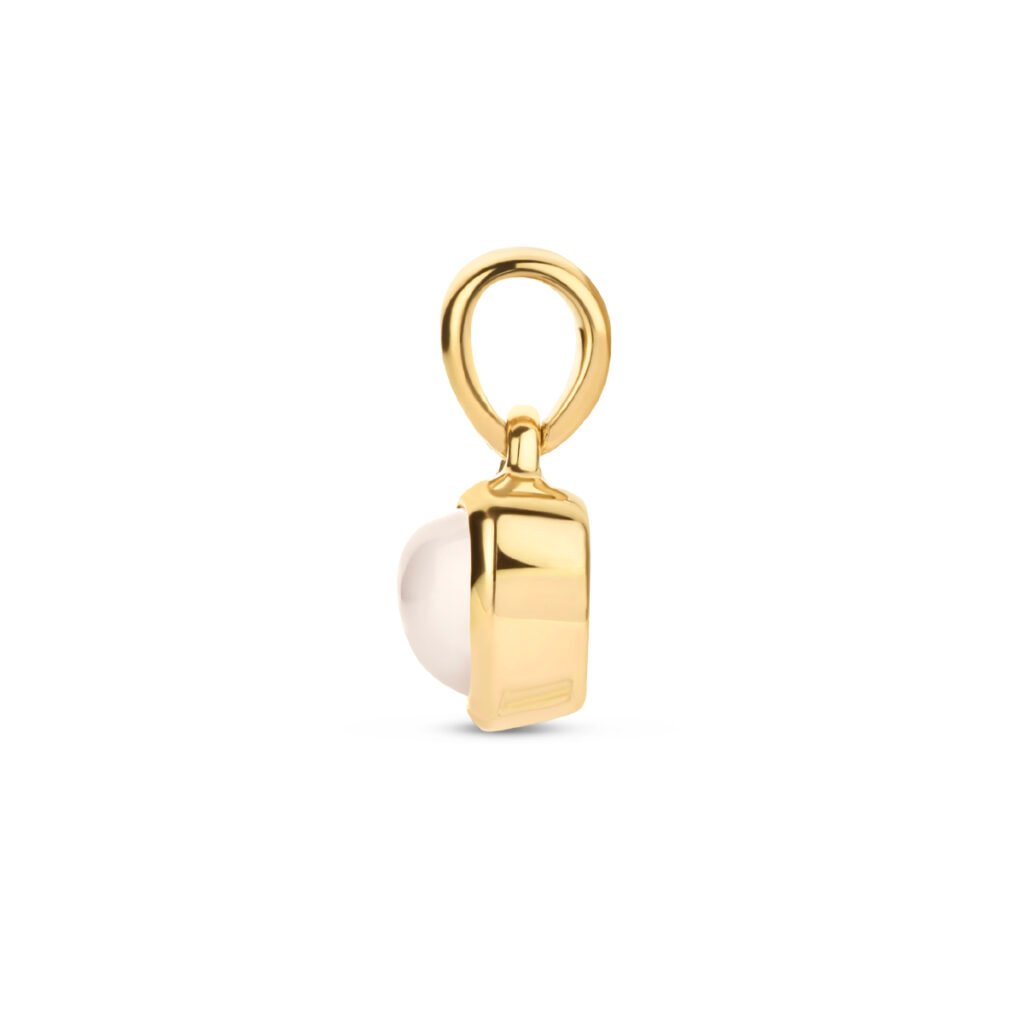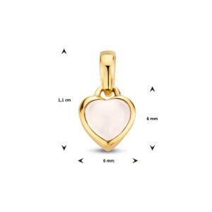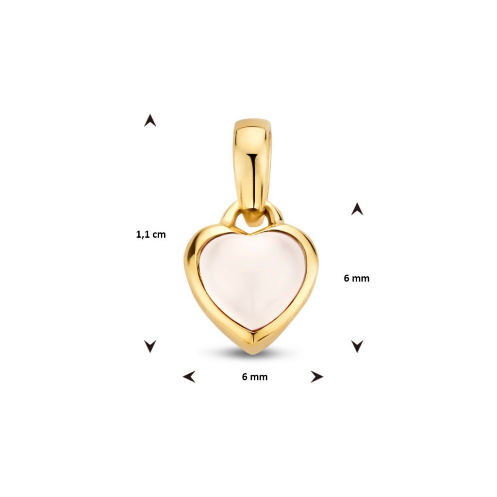 14k Geelgouden hanger uitgevoerd in de vorm van een hart met een maansteen. De hanger heeft een afmeting van 6x6mm en een totale hoogte van 1.1cm.