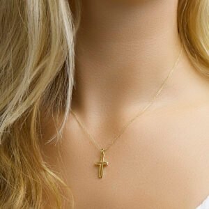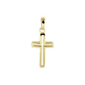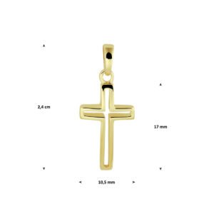 14k Geelgouden hanger in de vorm van een kruis. Het kruis heeft een afmeting van 17×10.5mm. De totale hoogte van de hanger is 2.4cm.