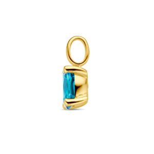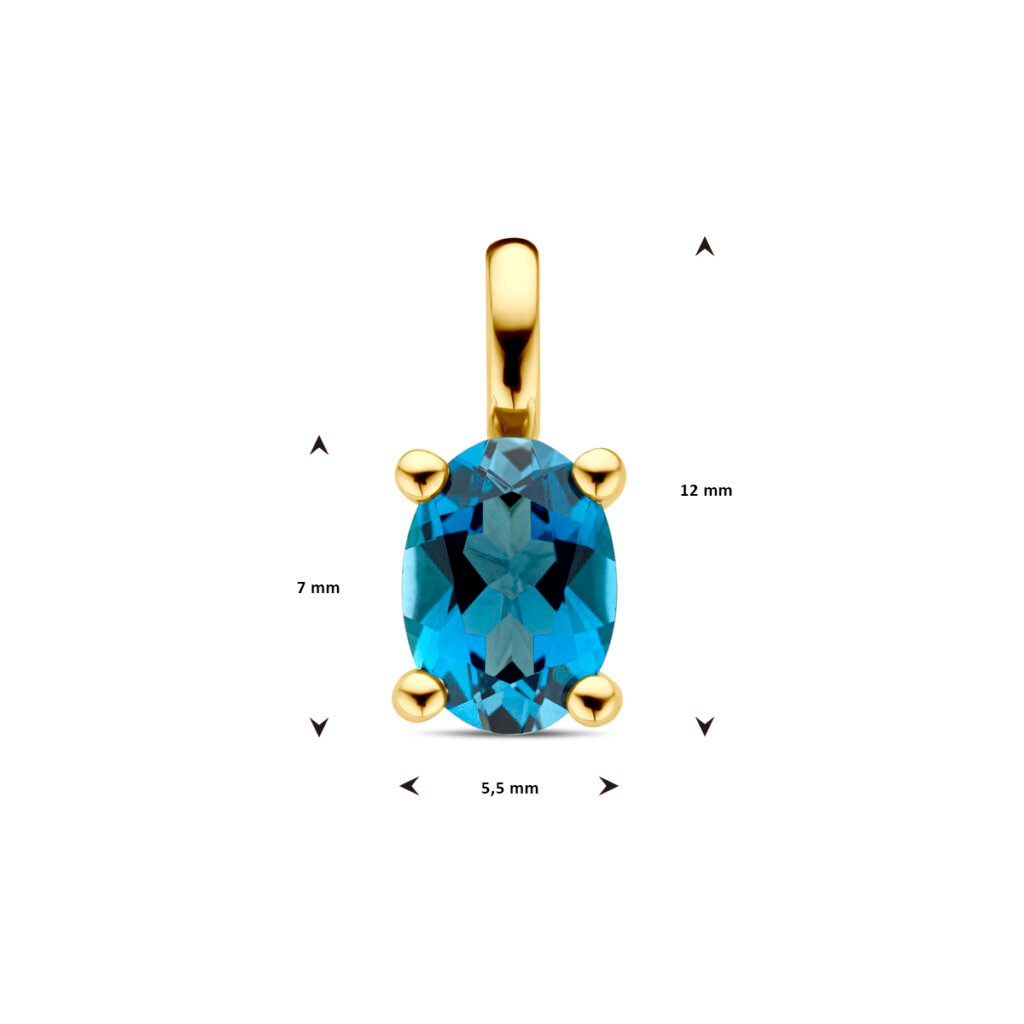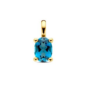 14k Geelgouden hanger uitgevoerd met london blue topaas. De hanger heeft een afmeting van 12×5.5mm.