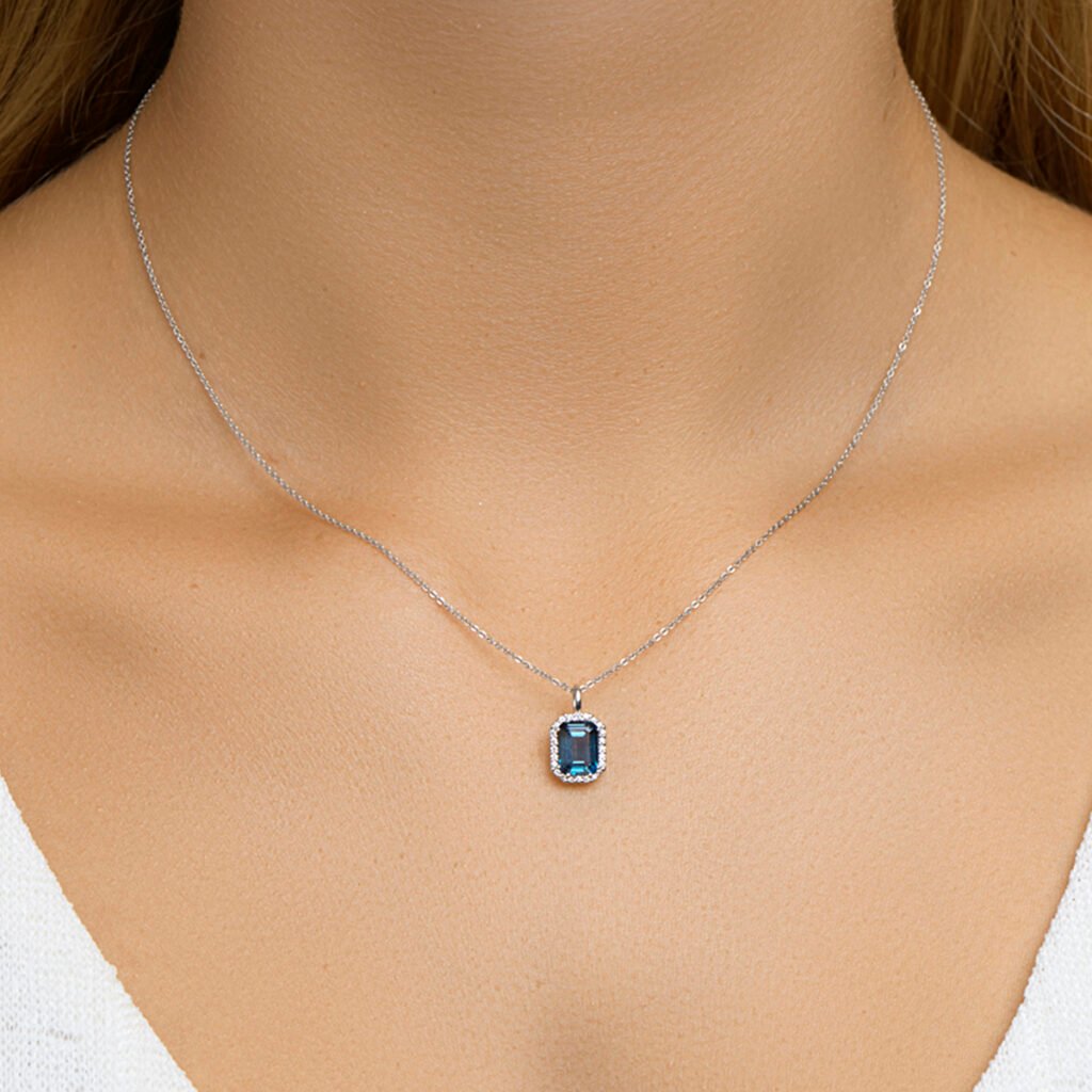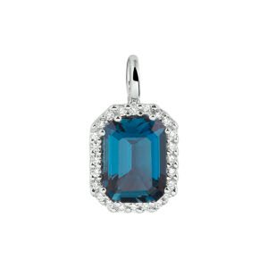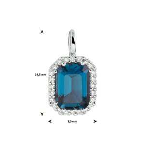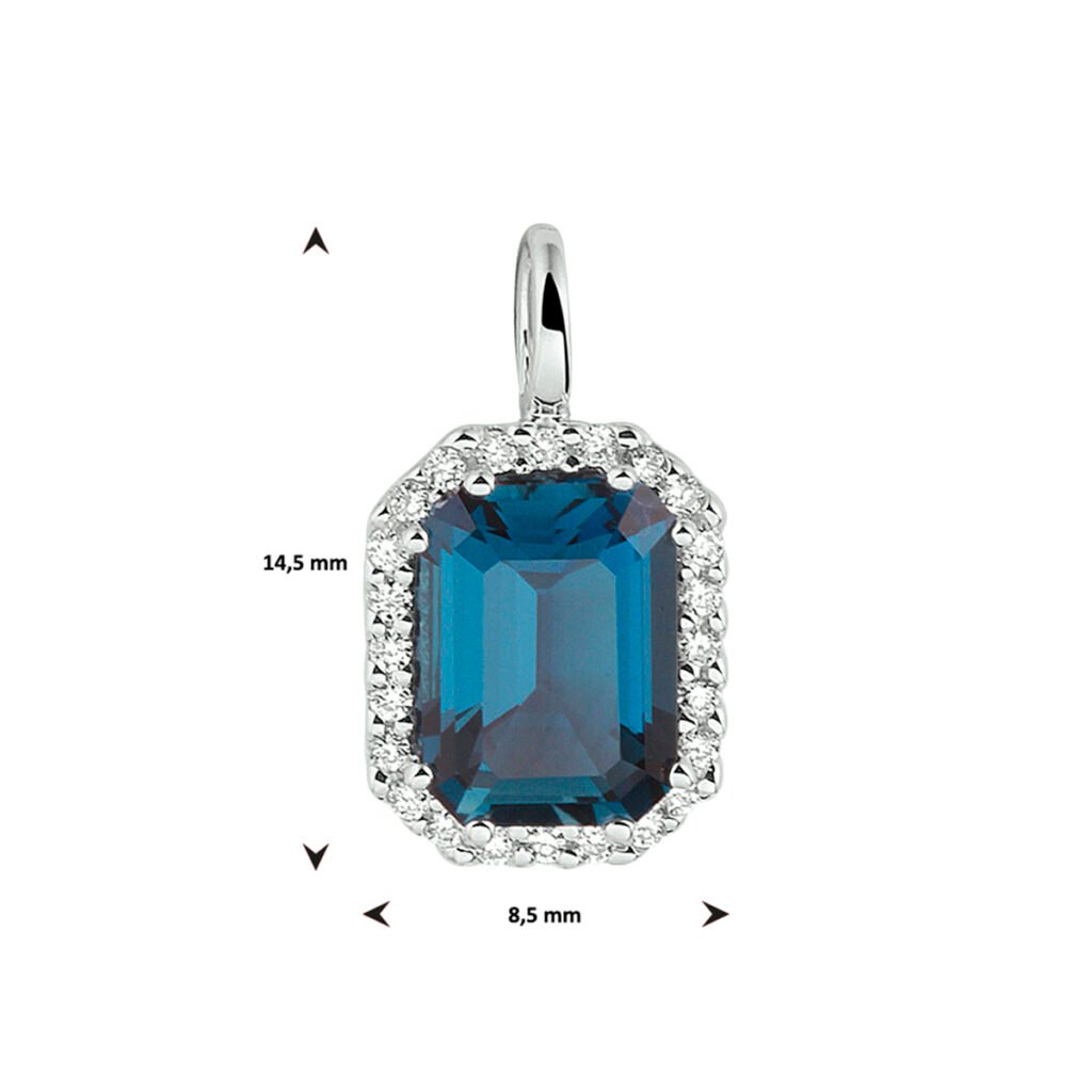 14k Witgouden hanger uitgevoerd met een schitterende London blue topaas en een diamant rij. De hanger heeft een afmeting van 14,5×8,5mm. De steenmaat is 8x6mm.
