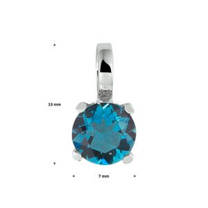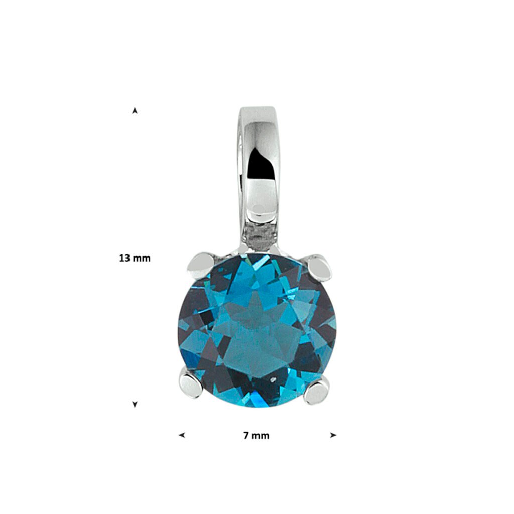 Deze hanger is volledig gemaakt van 14 karaats witgoud, de allerbeste kwaliteit witgoud, en voorzien van een fijntjes gepolijst oppervlak dat mooi glanst. Deze hanger bestaat uit een slank oogje waar u gemakkelijk een ketting naar keuze doorheen haalt, met daaronder een rond plaatje dat aan de voorkant voorzien is van een beeldschone blauwe Topaas edelsteen die mooi glinstert. Deze hanger heeft een afmeting van 7x13mm.