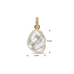 14k Geelgouden hanger uitgevoerd met zoetwaterparel en diamant. De hanger heeft een totale hoogte van 22.5mm. Het diamantgewicht is 0.04ct.