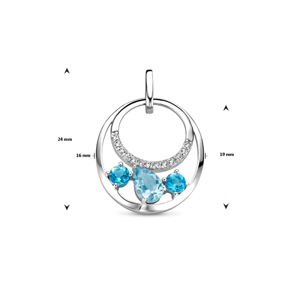 Gerhodineerd 925 zilveren hanger uitgevoerd met blauw en wit topaas. De hanger heeft een totale hoogte van 24mm.