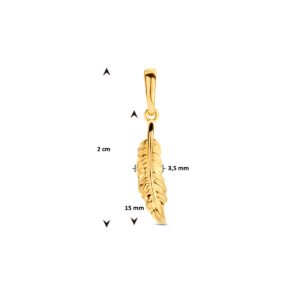 14k Geelgoud hanger uitgevoerd met een veer. De hanger heeft een totale hoogte van 2cm. Het veer heeft een afmeting van 15×3.5mm.