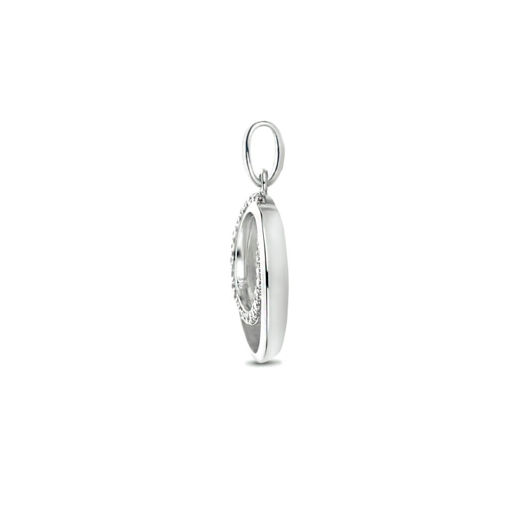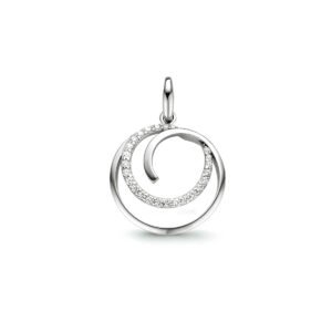Deze hanger is gemaakt van 925 sterling zilver, de allerbeste kwaliteit zilver. Het sieraad is gepolijst en voorzien van een laagje rhodium, wat ervoor zorgt dat de glans extra lang behouden blijft. De hanger is voorzien van een slank oogje, waar u gemakkelijk een ketting doorheen haalt, met daaronder twee een opengewerkte rondjes die mooi in elkaar overlopen. Het middelste rondje bestaat uit een rij met schitterende zirkonia steentjes. De hanger heeft een totale hoogte van 2,6 cm en een breedte van 8,3 mm.
